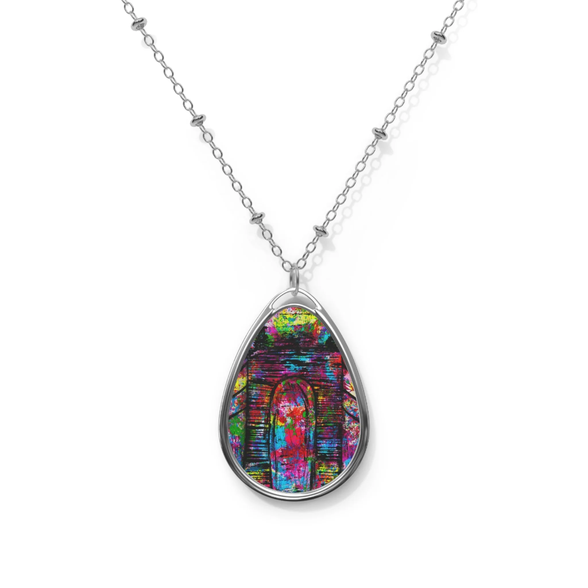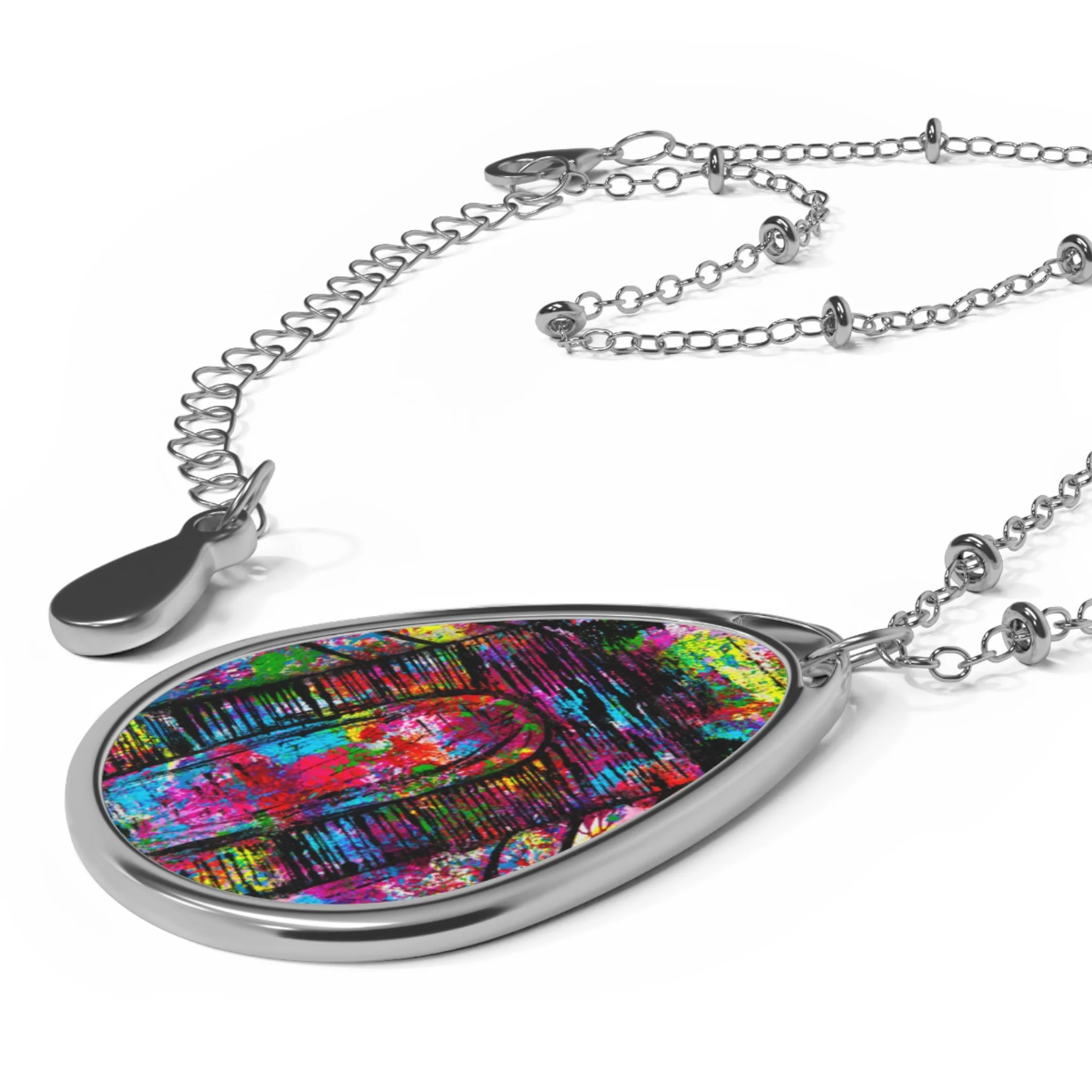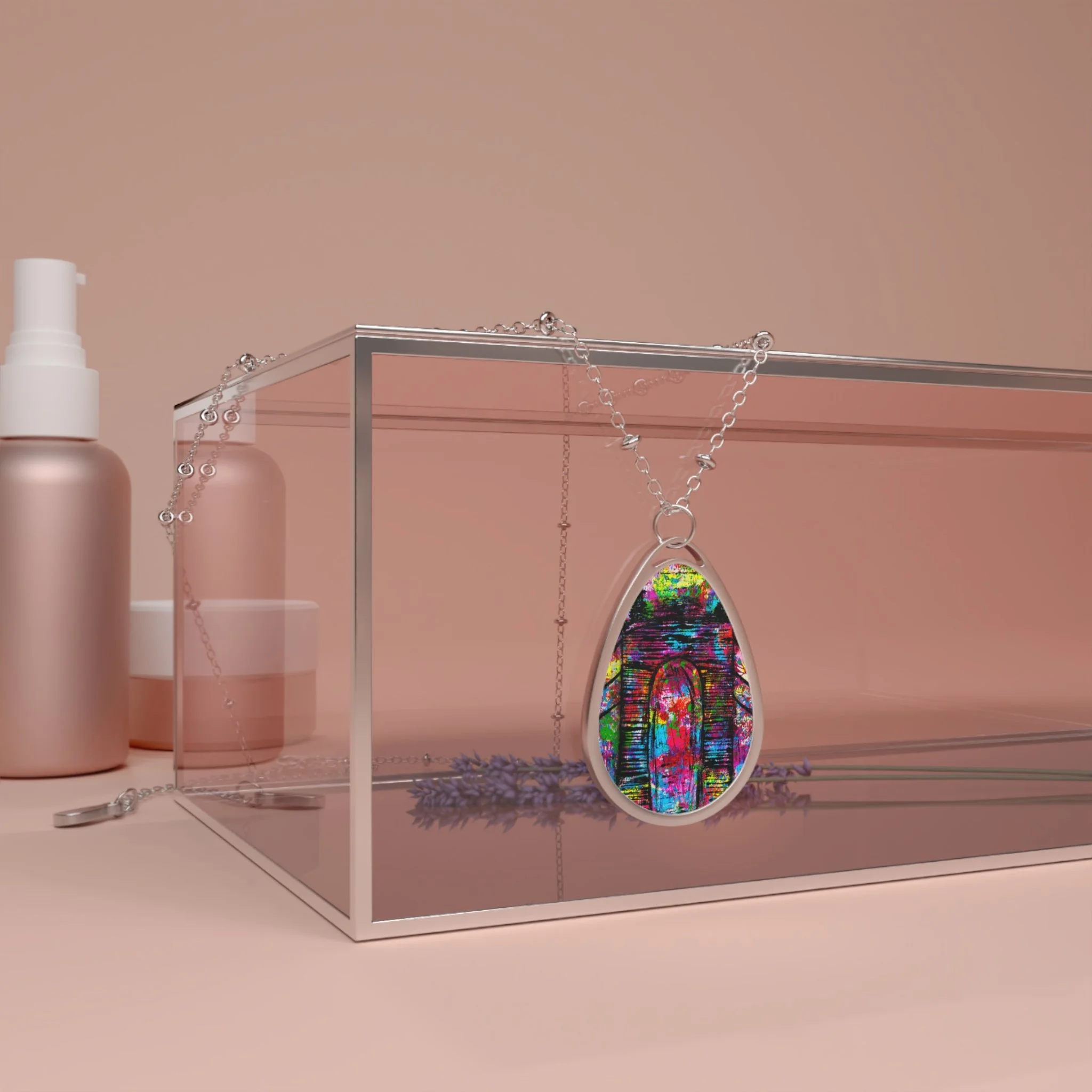 "Roebling Nights on July 4th” Oval Resin Pendant Necklace — Colorful Abstract Stained-Glass Teardrop